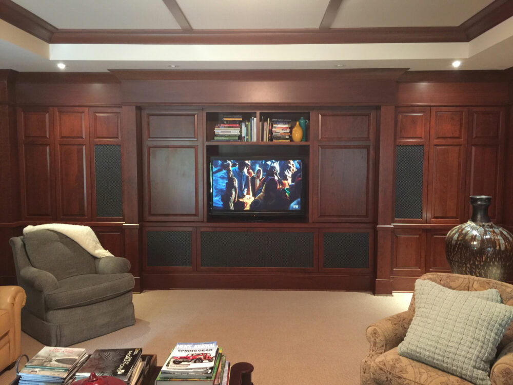 This home theater concept usually uses In-wall or In-ceiling speakers with the supporting equipment located in a closet or built flush into the wall. The attraction to this design is usually flexibility of the space. The decor can be easily changed and the space can be used for non-theater gatherings. Many clients choose this direction to keep the equipment out of reach from children and pets. Builders installing Home Theaters into spec homes tend to like this type of solution too. It allows them to provide a built-in, functioning theater while leaving the personal touches to the buyer. The drawback to this idea is the impracticality of moving the system. The layout can’t readily be rearranged and components cannot be removed without incurring repair costs.